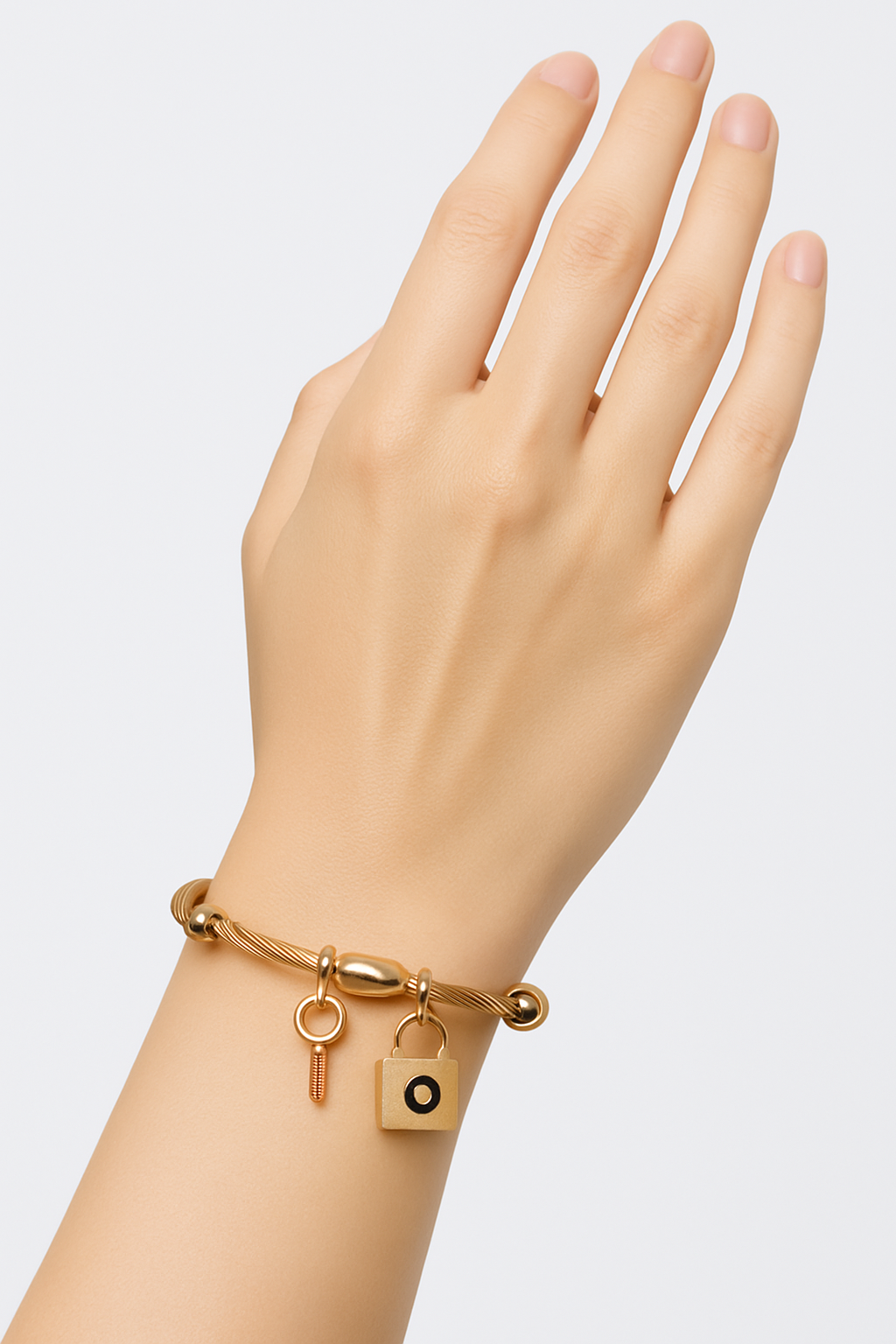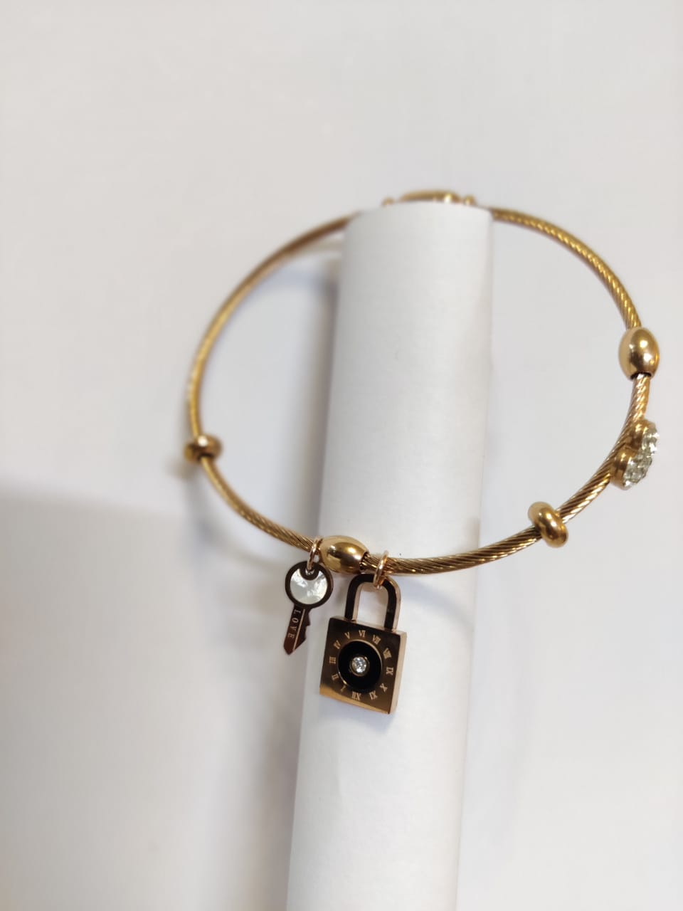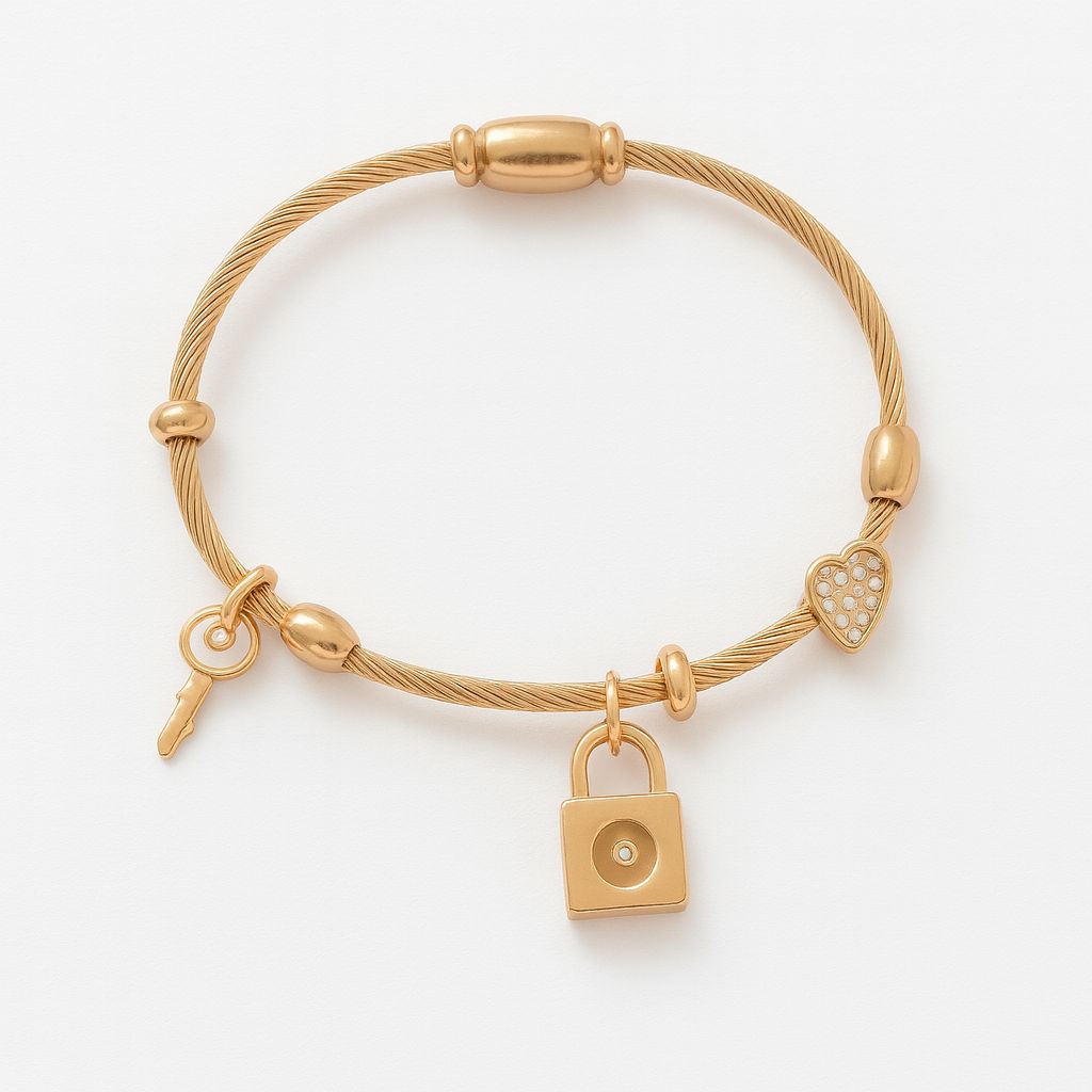 Golden Charm Bracelet with Lock & Heart – A stylish golden bracelet featuring a sleek chain adorned with unique charms including a sparkling heart, a classic lock, and delicate accents. Its modern yet elegant design makes it a versatile piece, perfect for adding charm and sophistication to everyday looks or special occasions.