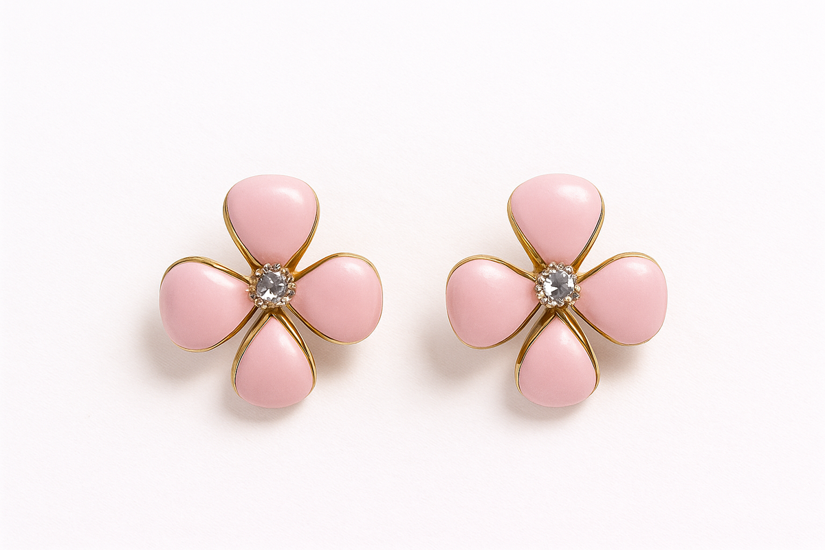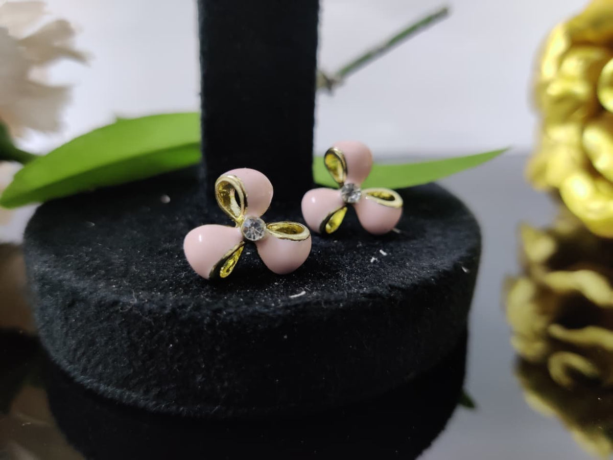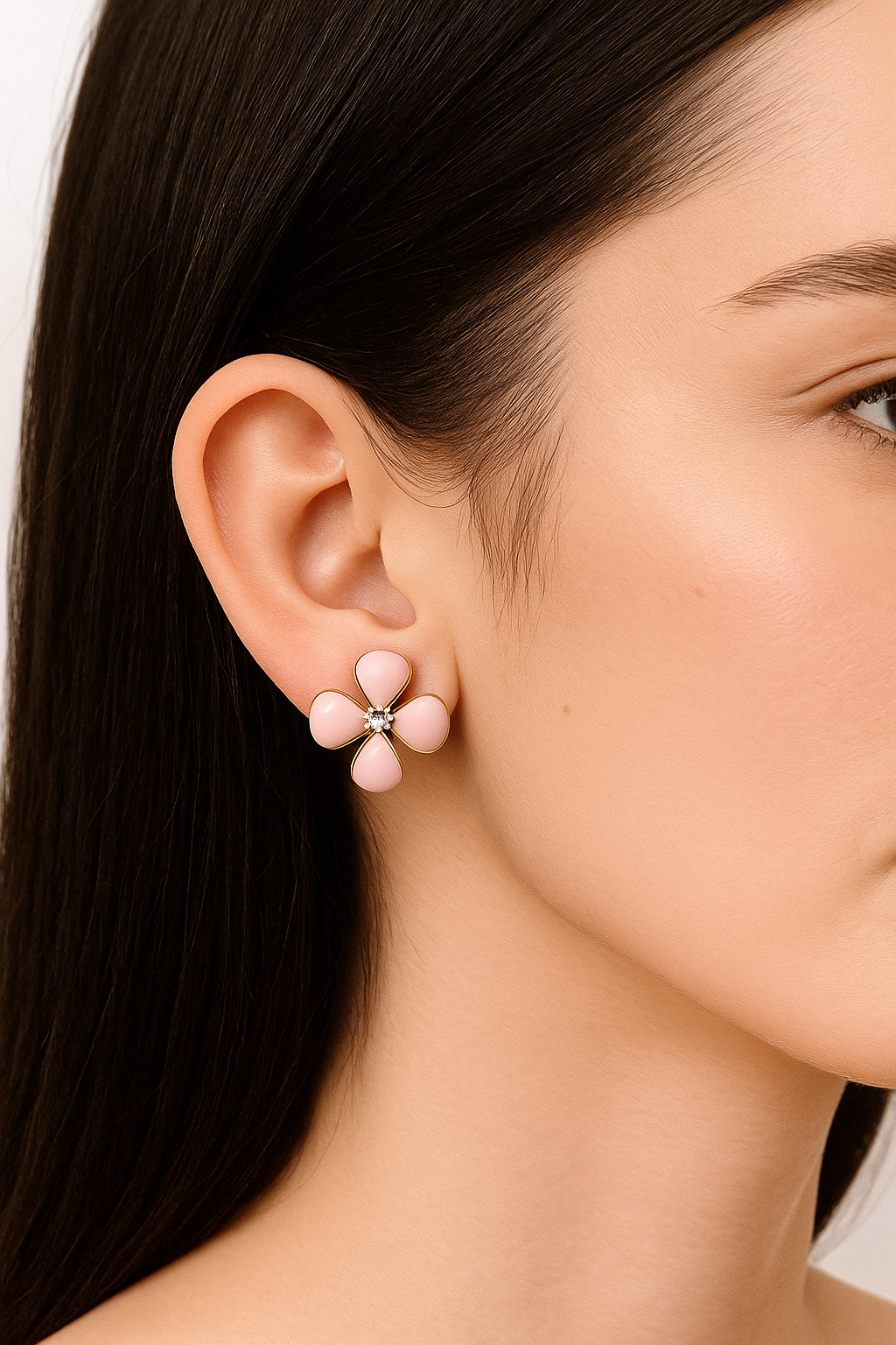 Adorable Flower shaped studs featuring soft pink enamel petals outlined in gold,with a sparkling stone at the centre -perfect for adding a sweet, playful touch to everyday outfits.