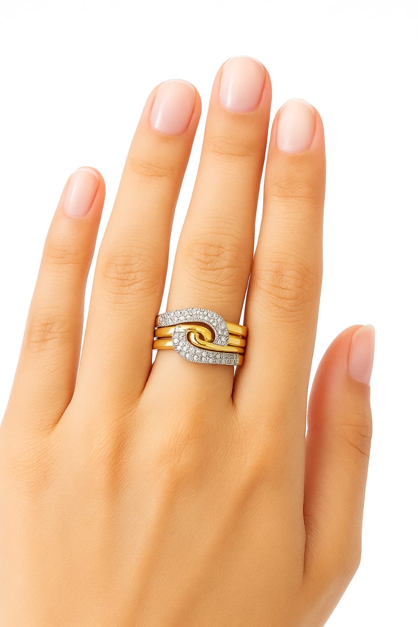 Infinity Bond Ring:- The Infinity Bond Ring features intertwined gold and crystal-lined bands forming a graceful loop that signifies endless connection and strength. Radiant and modern, it’s a symbol of eternal elegance — perfect for those who wear their confidence and grace effortlessly. Made with stainless steel and 18K gold Plated.