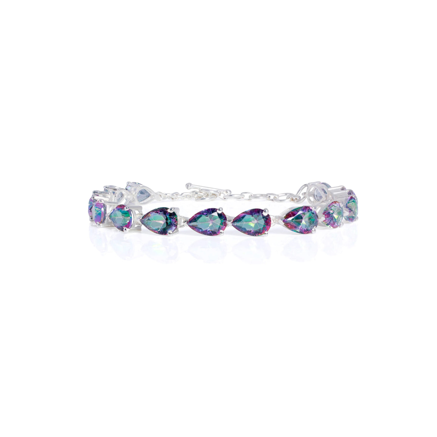 The Mystic Aurora Bracelet dazzles with a kaleidoscope of shifting colors, capturing the magic of northern lights in each teardrop-shaped stone. Crafted in polished sterling silver, this bracelet features a series of faceted mystic topaz gems that radiate shades of violet, green, and blue depending on the light. The sleek prong settings and adjustable clasp make it both secure and effortlessly elegant. Perfect for evening wear or to add a spark of enchantment to any look, this bracelet is a bold expression of mystery, color, and celestial charm.
