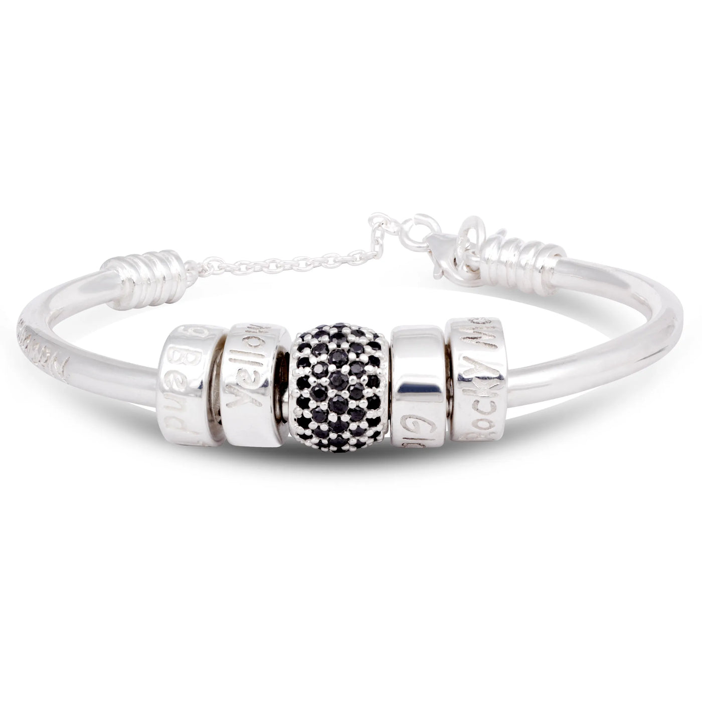The Urban Edge Charm Bangle blends bold attitude with minimalist sophistication. Crafted from high-polish silver, this structured bangle features a central black pavé bead flanked by engraved metallic spacers, adding a touch of texture and contrast. The secure chain clasp offers both style and safety, while the rotating charm details give it a dynamic, street-smart vibe. Perfect for those who love contemporary fashion with a statement twist—this piece is edgy, versatile, and effortlessly cool.
